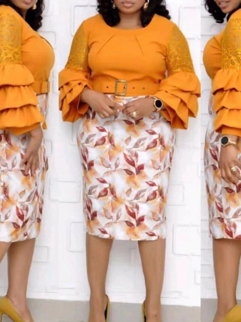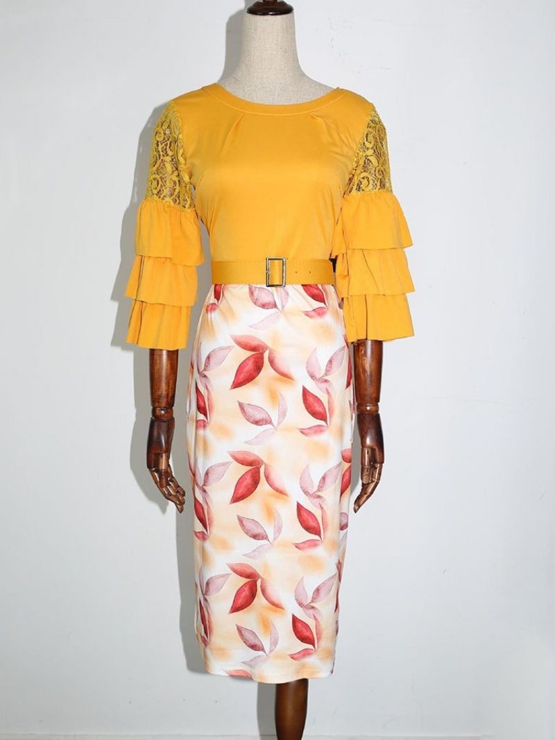 S Plus-Koon Pyöreä Kaula-Printti Kolme Neljäsosaa Hihaa Sisältävä Röyhelöhihainen Mekko