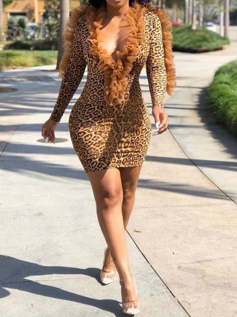 V-Kaula-Aukkoinen Stringy Helvedge Above Knee Leopard Mid Waist Mekko