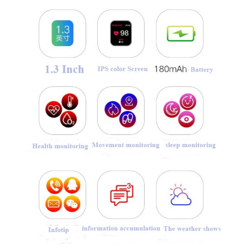 - Toiminto: Passometer, Unimittari, Kuntomittari ,Älykäs Muistutus,Sosiaalinen Viihde,Valokuva,Musiikki,Push-Viesti,Kaukosäädin,Sijainti,Sos-Hälytys