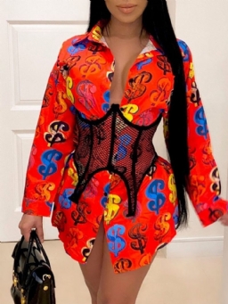 Color Block Lapel Print Pitkähihainen Pitkä Pusero
